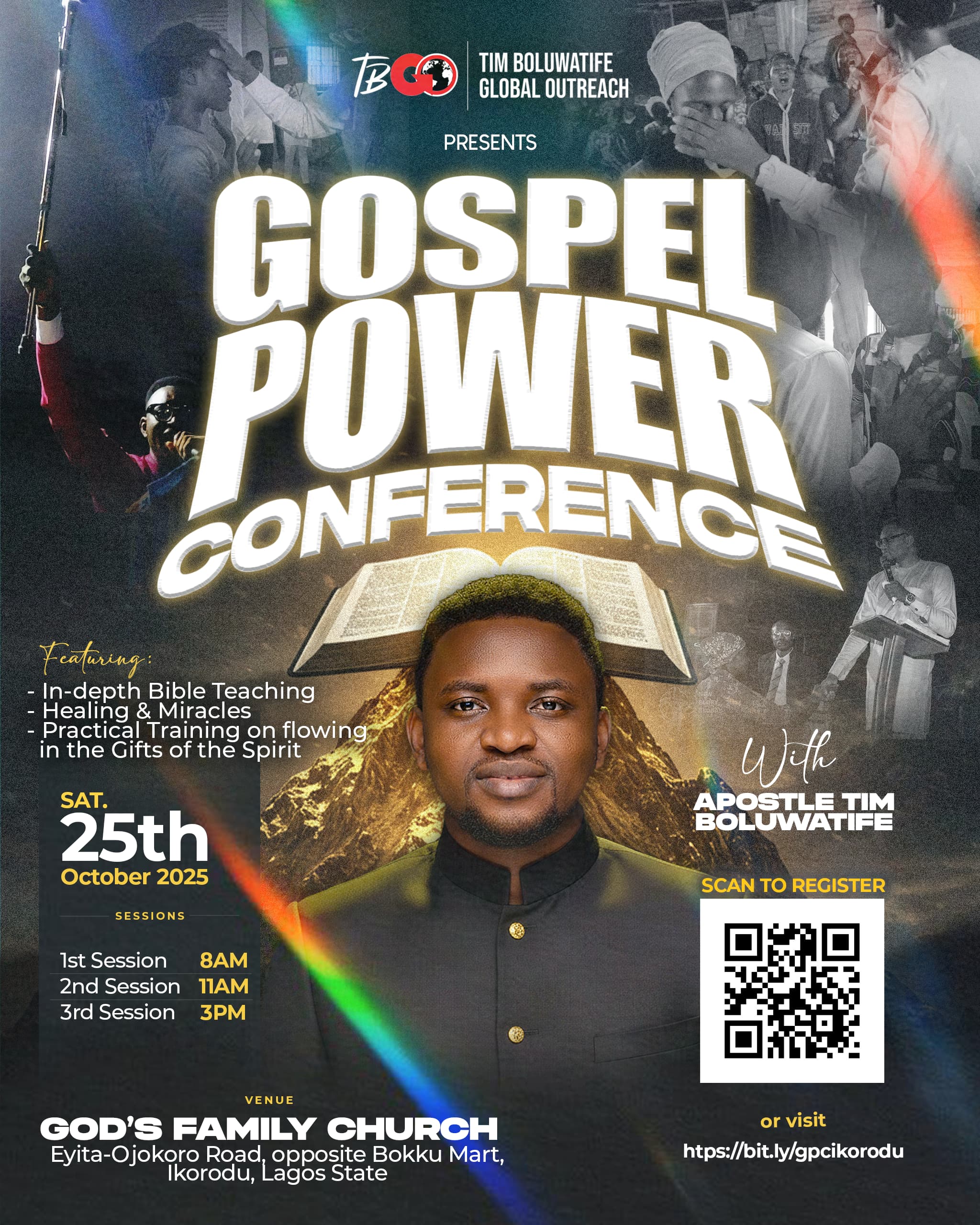 Gospel Power Conference (GPC) with the man of God, Apostle Tim Boluwatife, is the Spirit’s initiative to unveil the power available in the gospel, for the manifestation of the sons of God in these last days. This conference features the preaching of the gospel, revelatory teachings, miraculous demonstrations of the power of God, and practical training for every participant to take the power of the gospel to their world through the ministry of the Spirit.